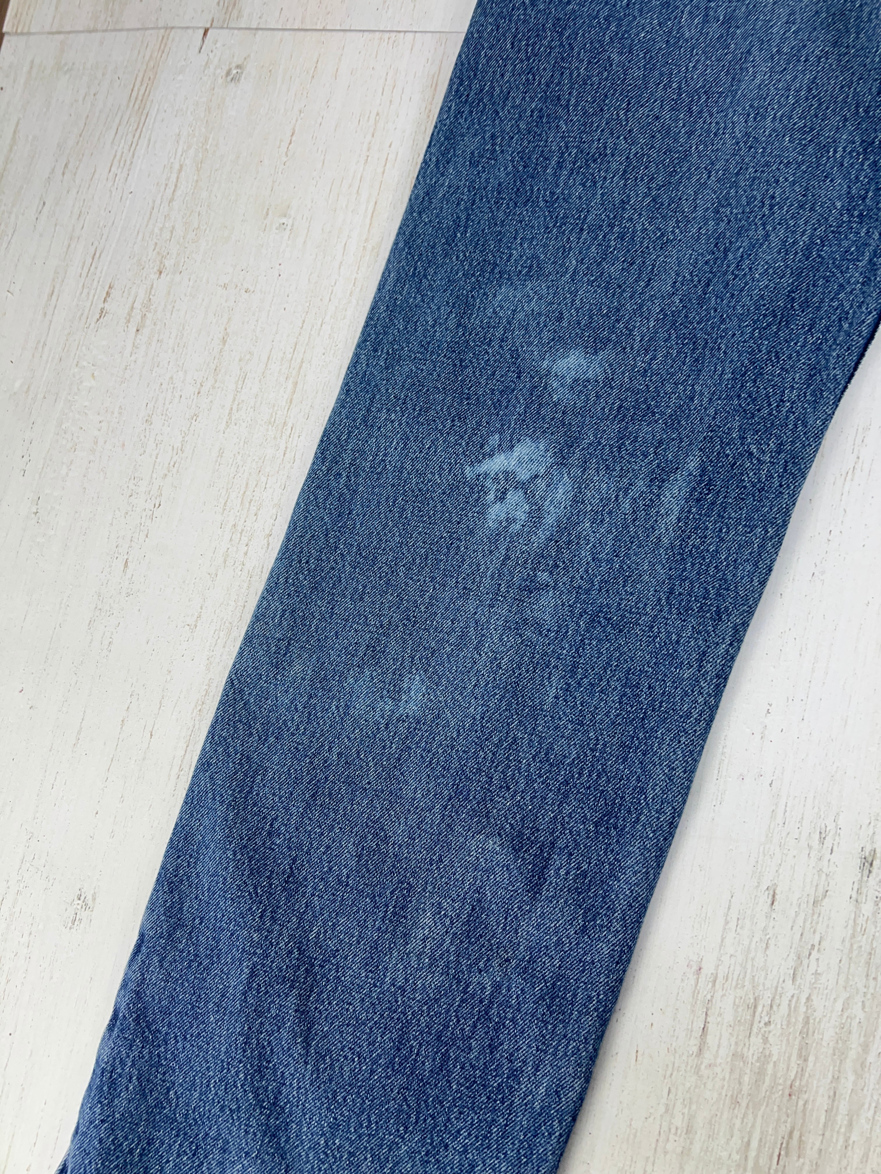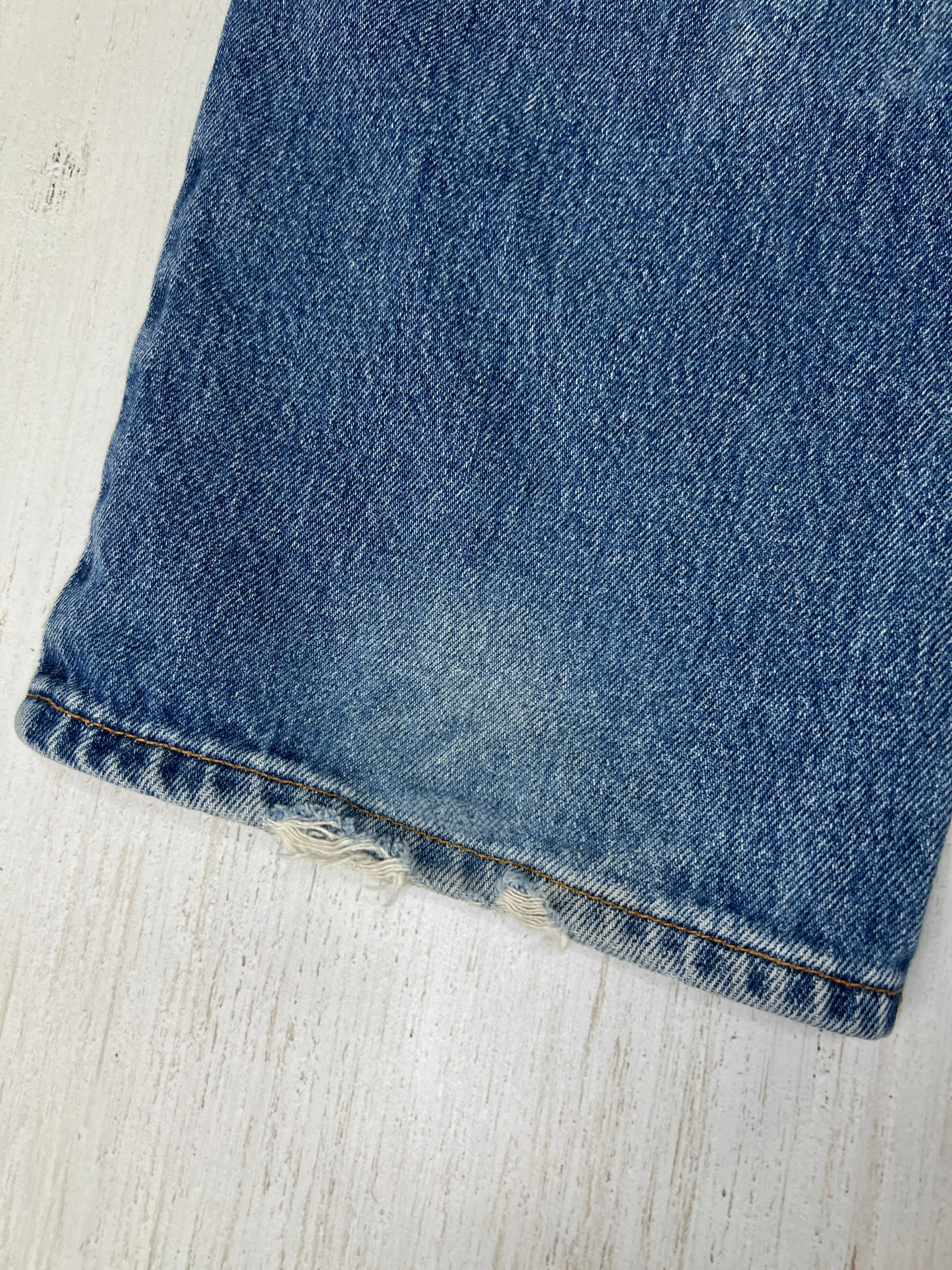 Levi’sのルーズフィットモデル「581」。淡いインディゴとブリーチ痕、裾のダメージがリアルな古着感を演出。Y2Kやストリートスタイルにぴったりな1本です。