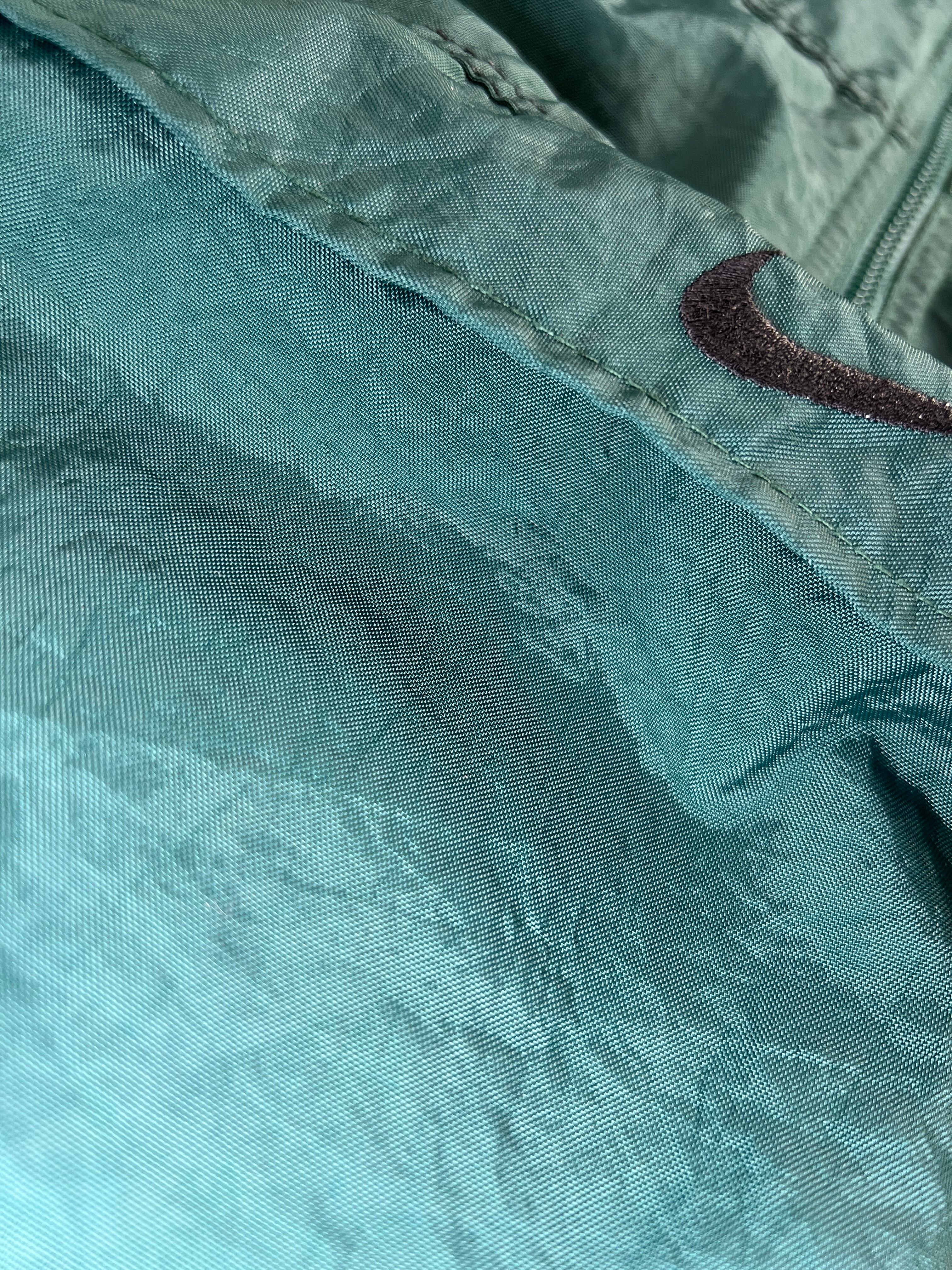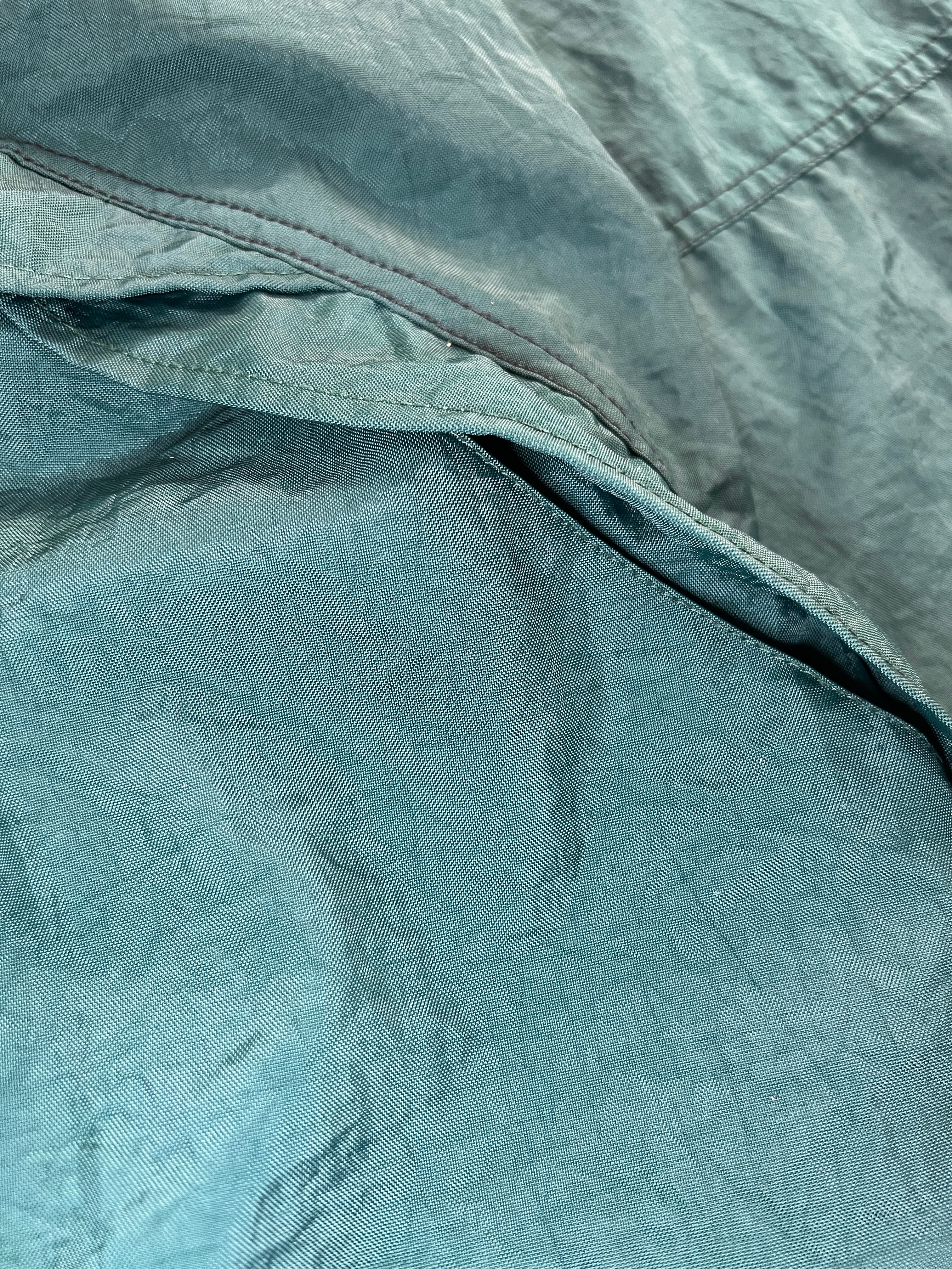 90sナイキ製、マレーシア製ナイロンアノラックパーカー。深みのあるグリーンにブラックスウッシュ刺繍、ハーフジップ&カンガルーポケット仕様。ストリートからスポーツミックスまで幅広く使える1着。