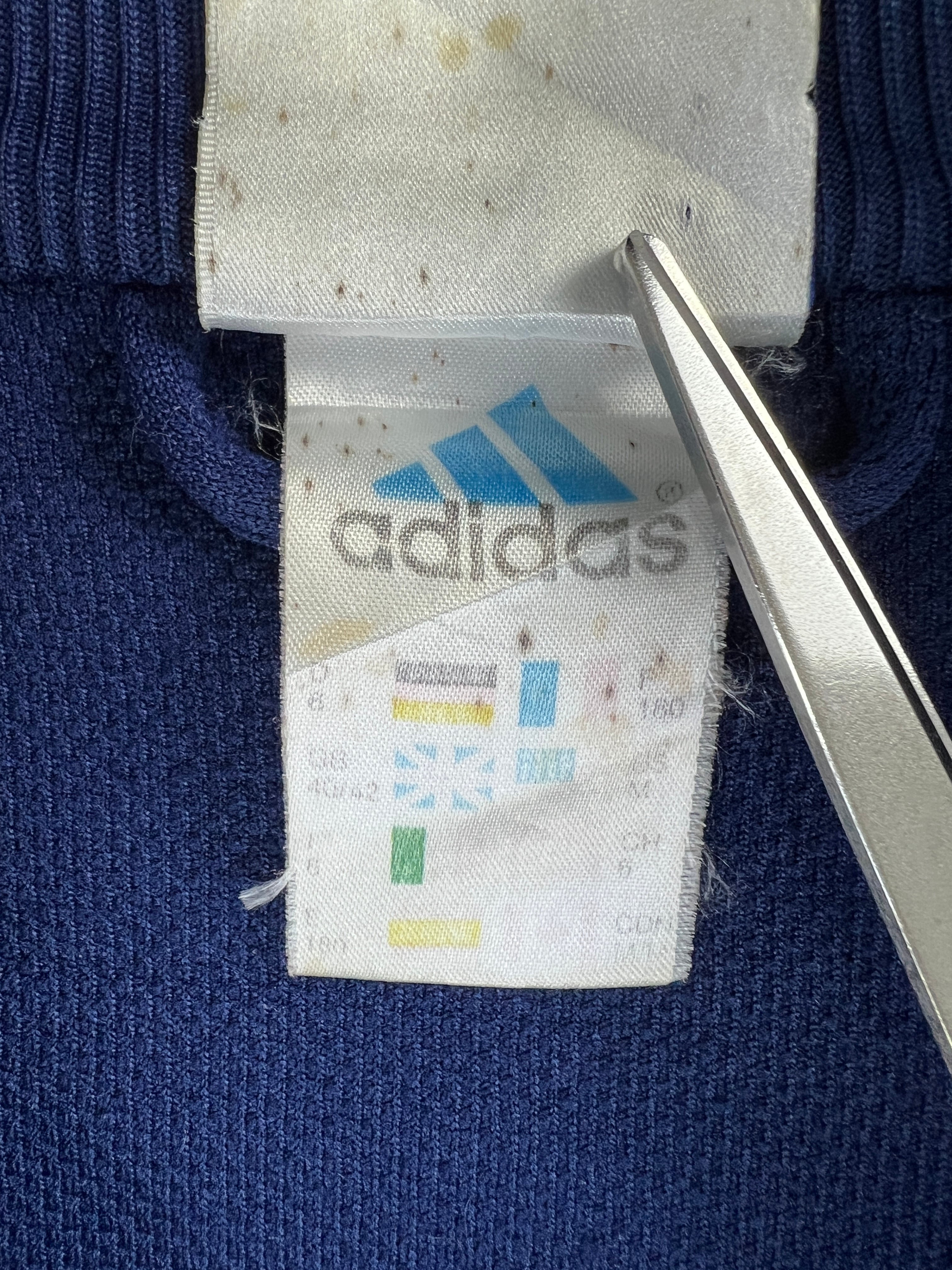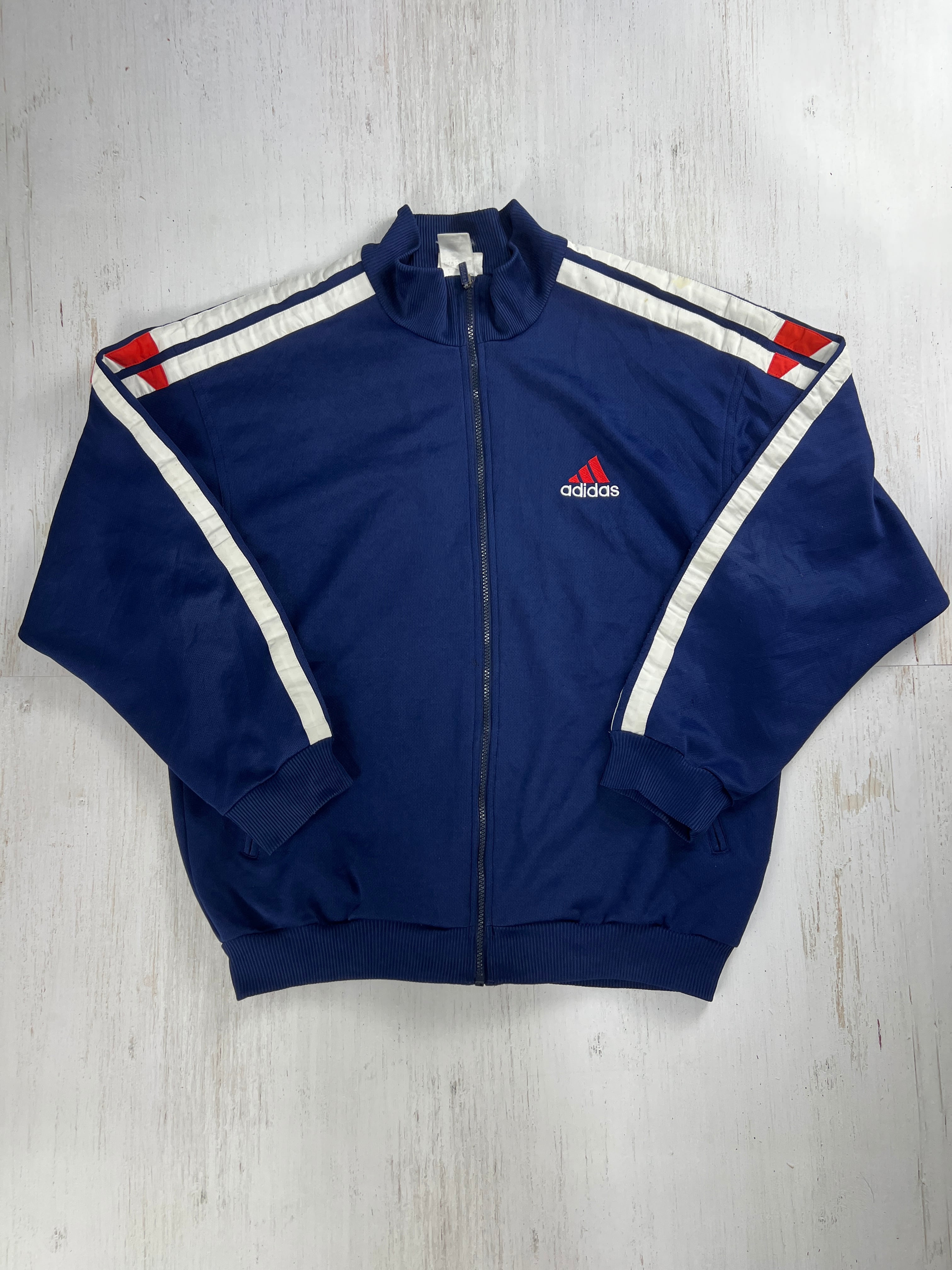 アディダスのパフォーマンスロゴ期トラックジャケット。ロイヤルブルーをベースに、袖のホワイトテープと肩のレッド切替が効いた一着。胸は小さめ刺繍ロゴ、スタンドカラー、ハンドジップポケット。