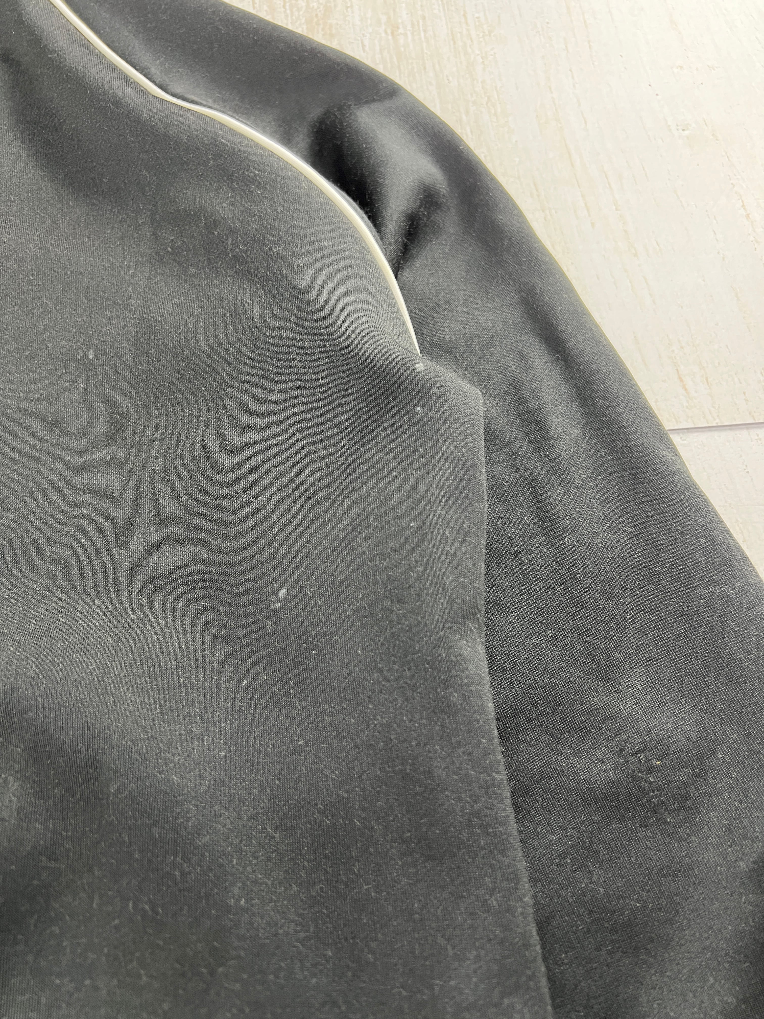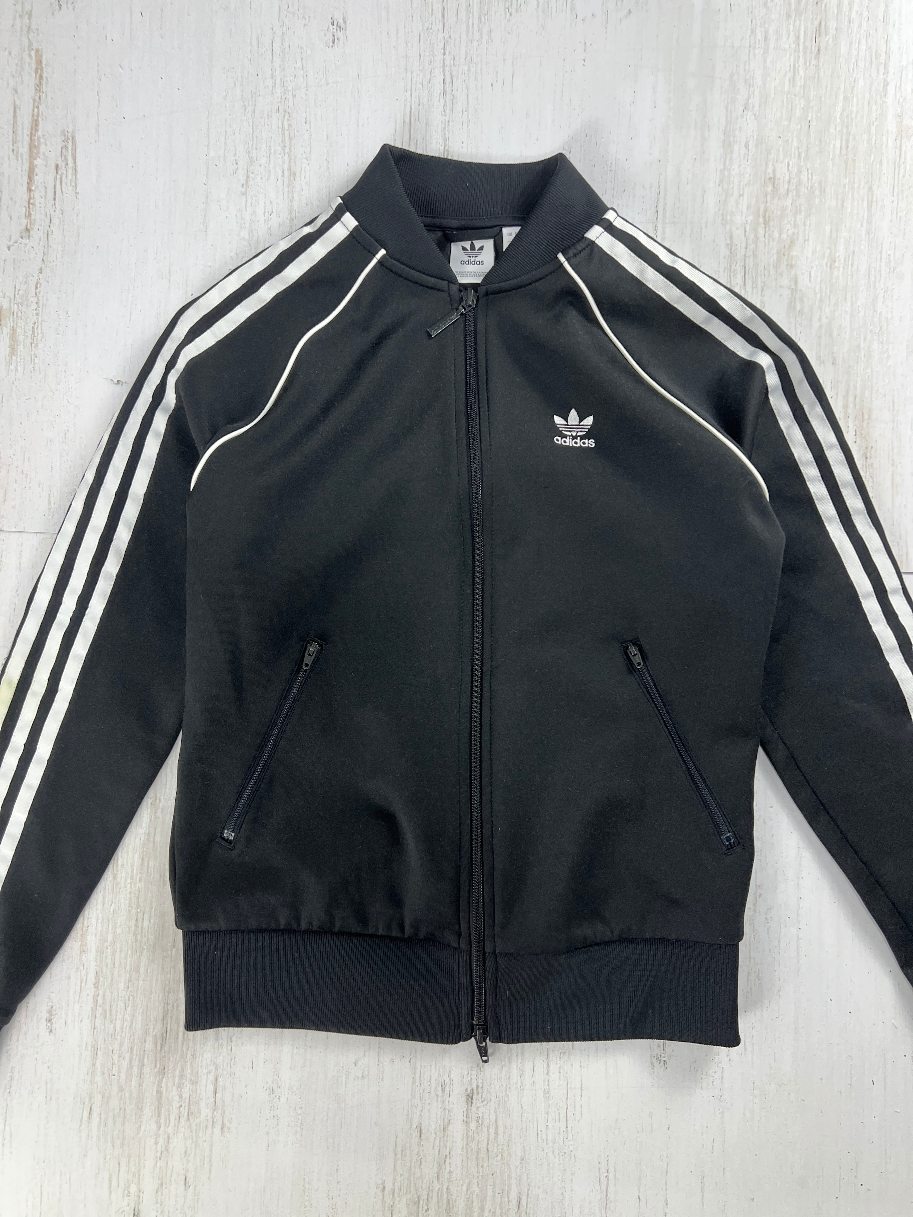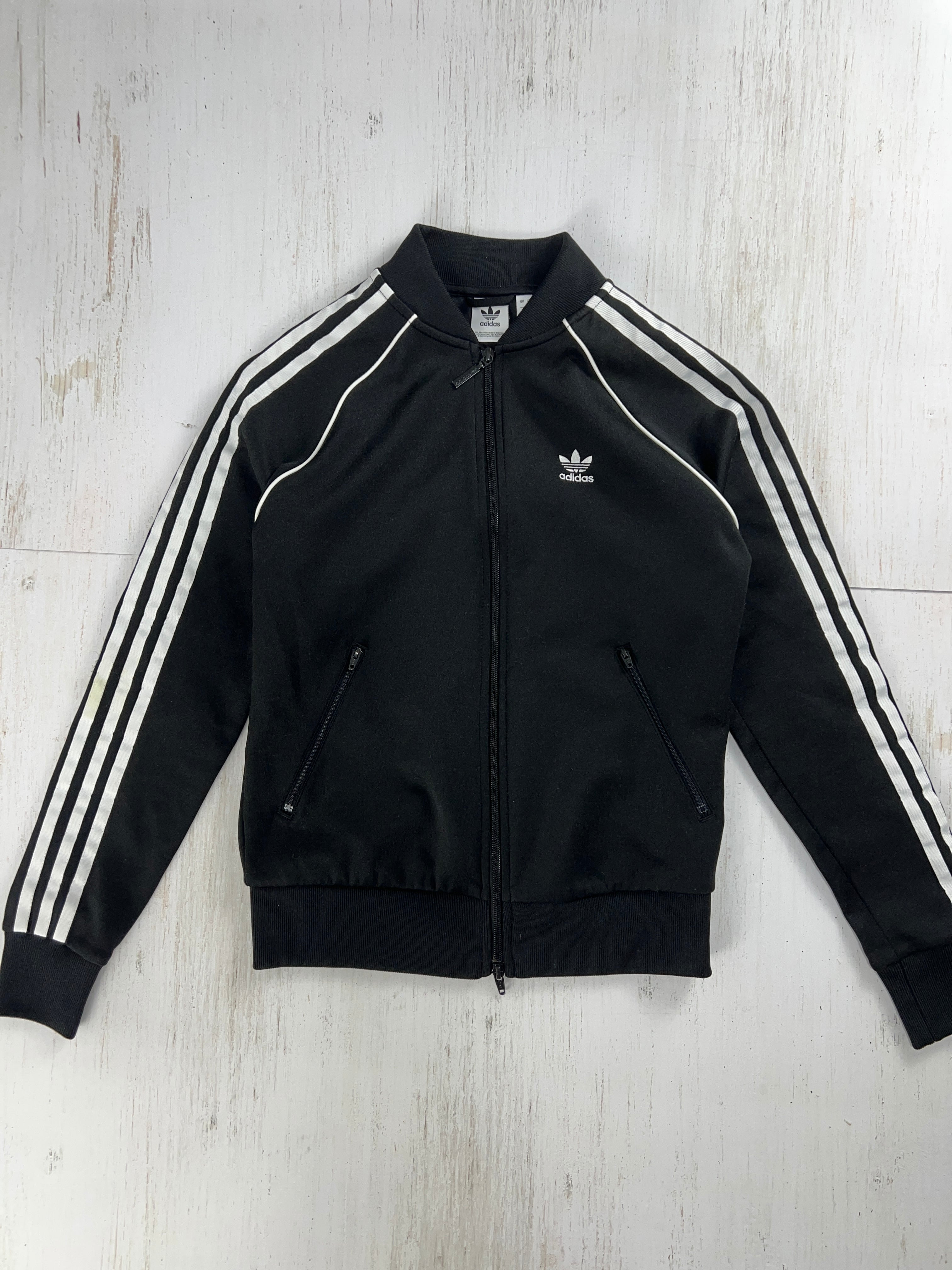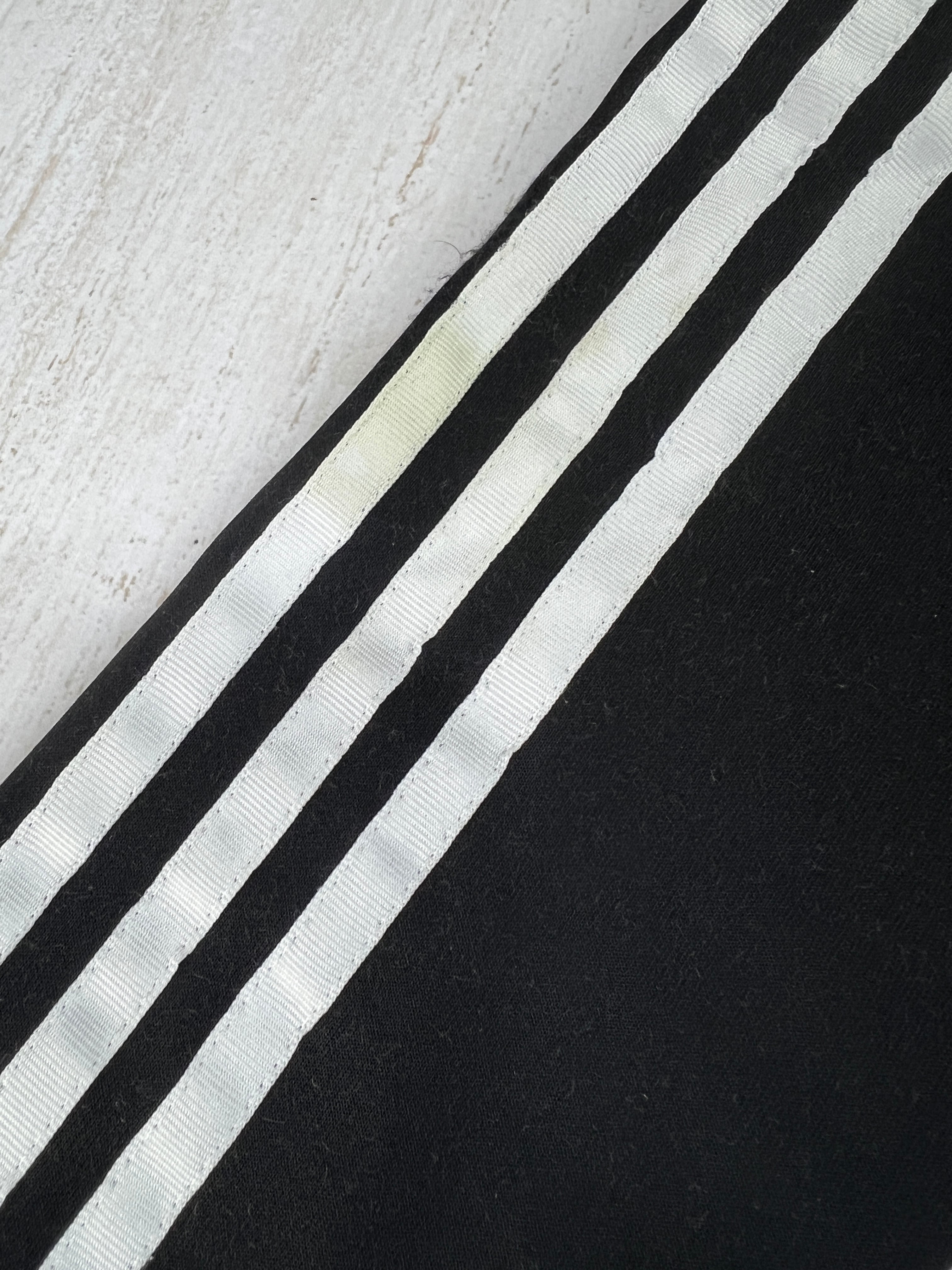 ブラックにホワイトの3ストライプ、胸のトレフォイルロゴ刺繍が際立つ王道デザイン。