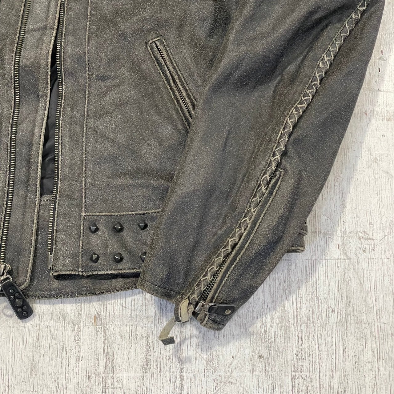 ライダースらしいディテールの袖先のジッパーや裾のバックルの他に、袖にはレザーを編み込んだライン、裾にはスタッズが散りばめられた男らしいデザインです。